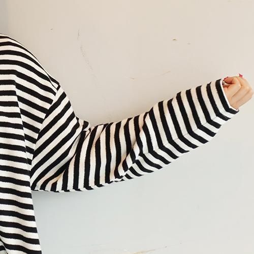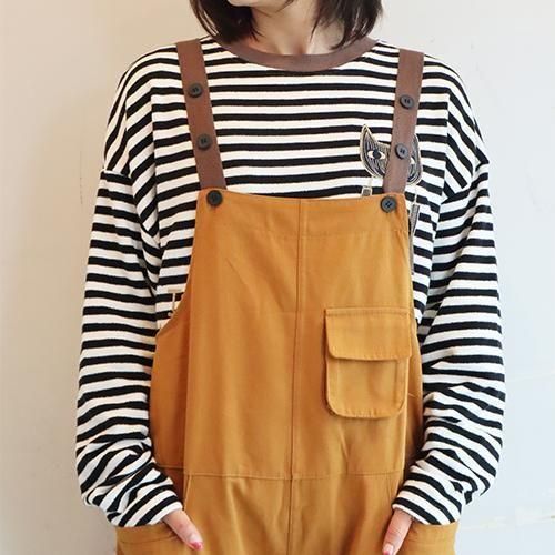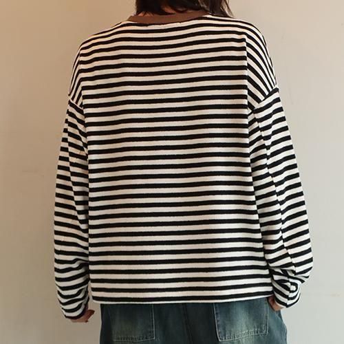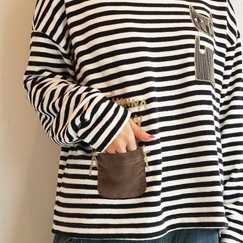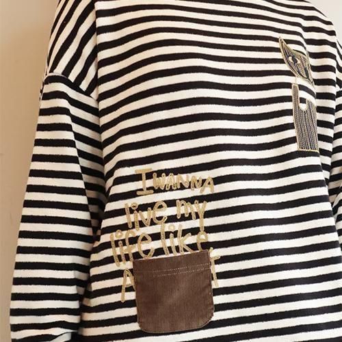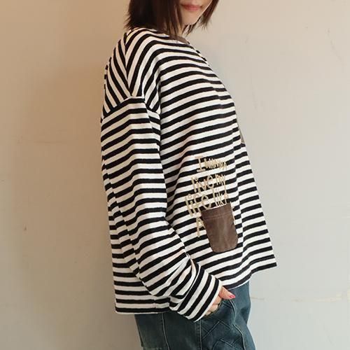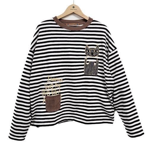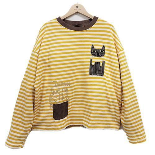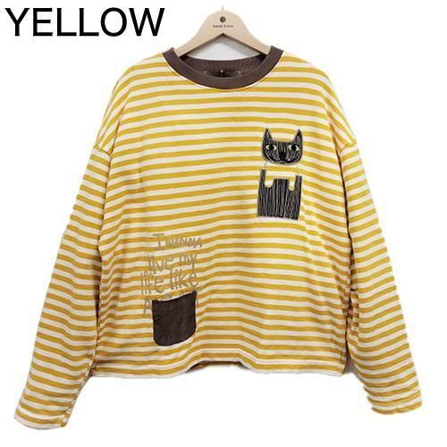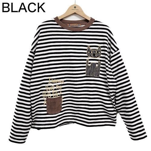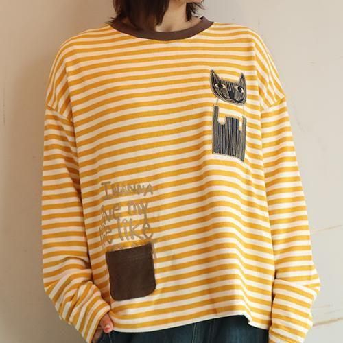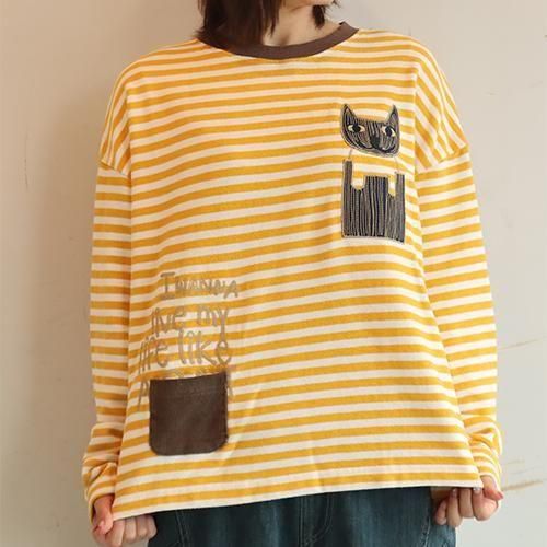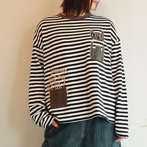 ・胸元のネコアップリケとポケットが愛らしいアクセント。ボーダー柄がカジュアルな着こなしにピッタリの1枚です♪