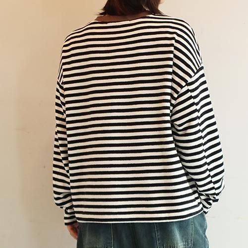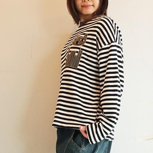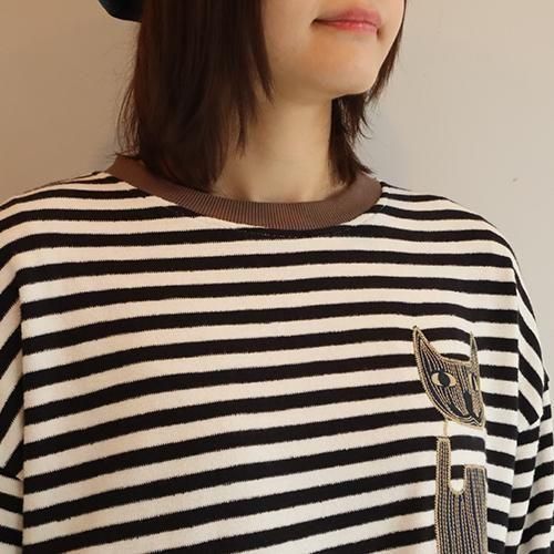ボーダー柄にネコのアップリケをあしらった、大人の遊び心が光るカットソー。