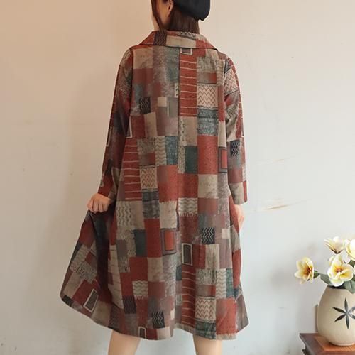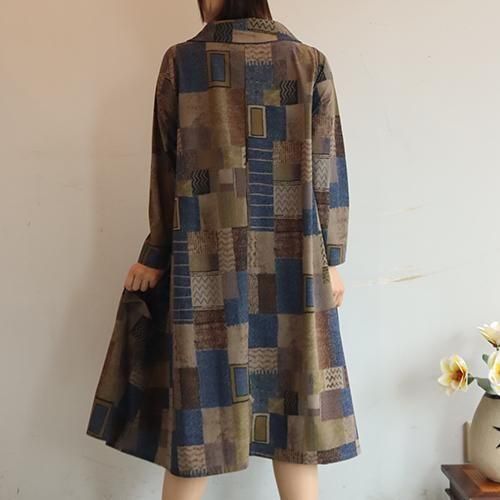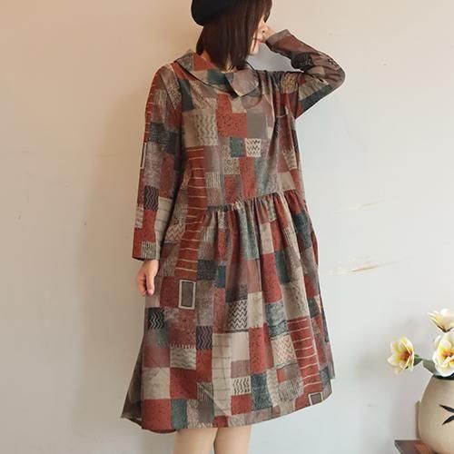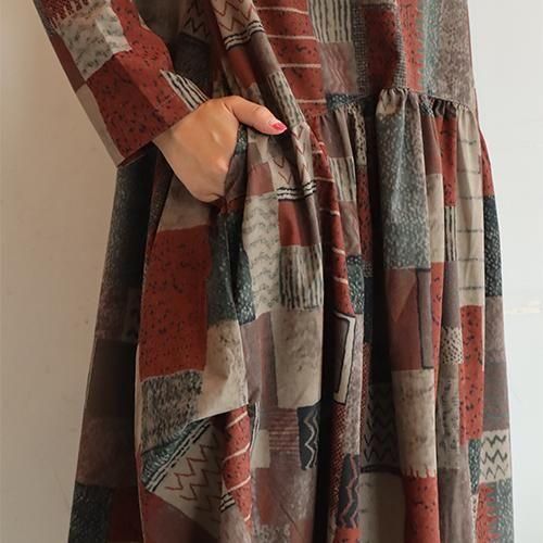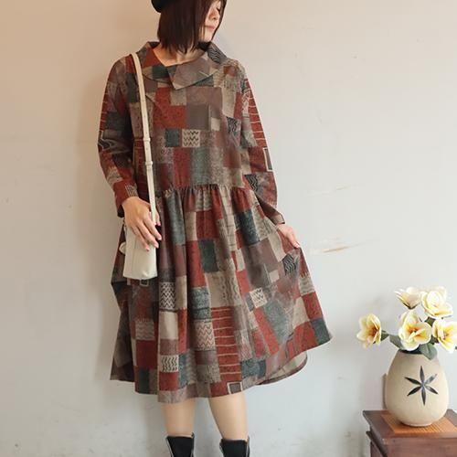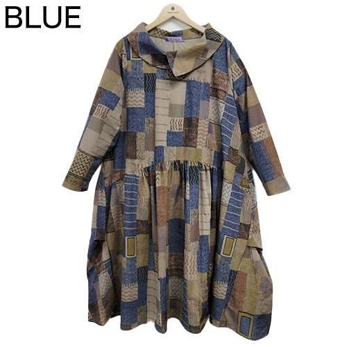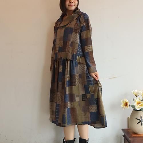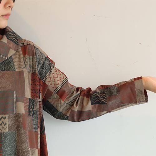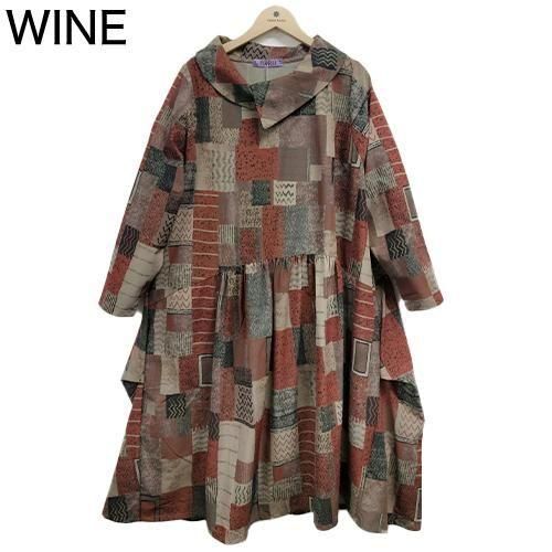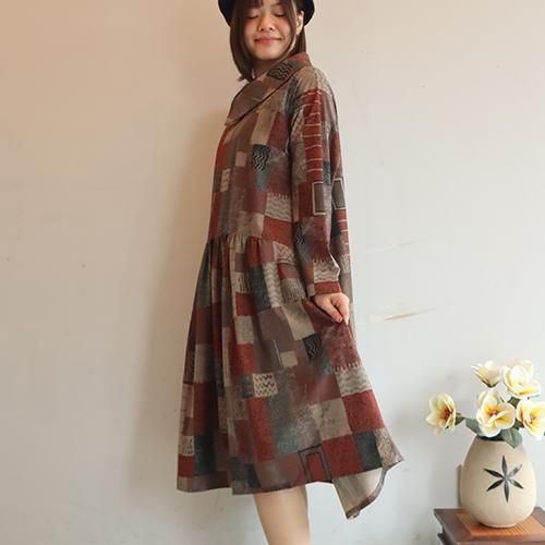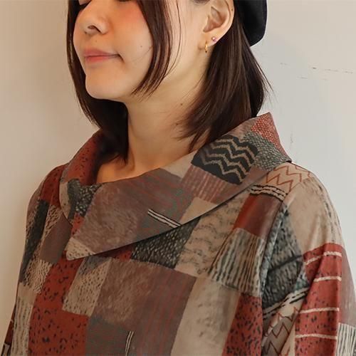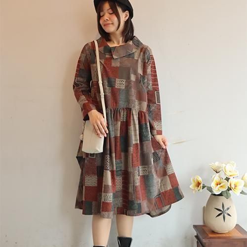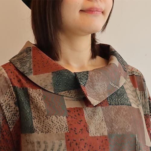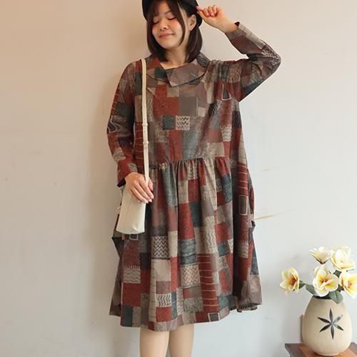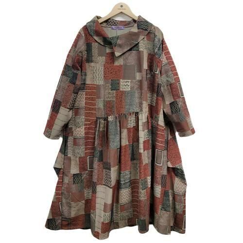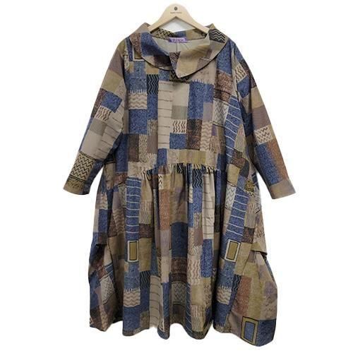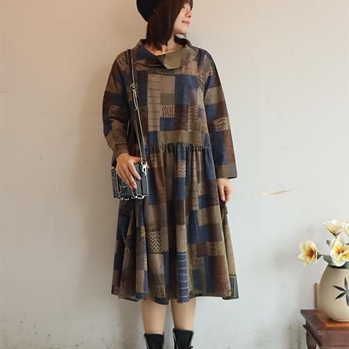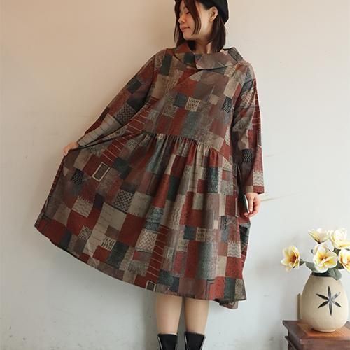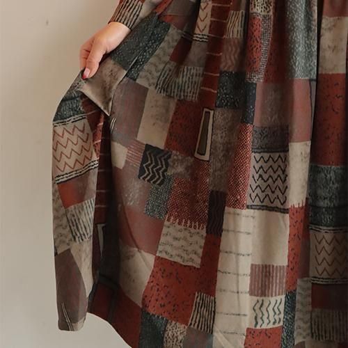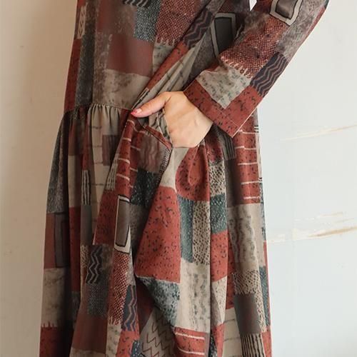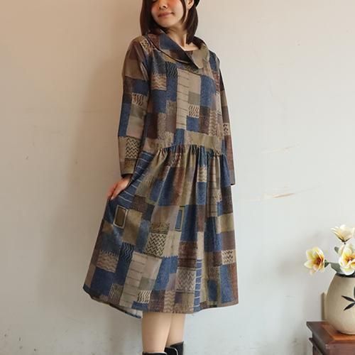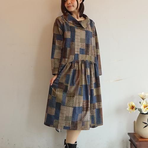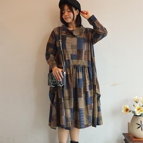 レトロ感のあるパッチワーク風プリントが目を引くワンピース。