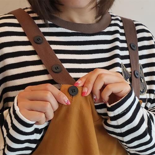 ・ナチュラル感のあるブラウンのショルダーベルトがアクセント。肩紐はボタンで調節可能、体型に合わせた着こなしが叶う