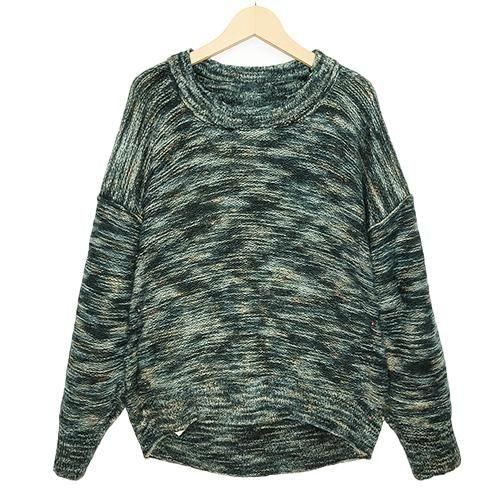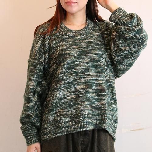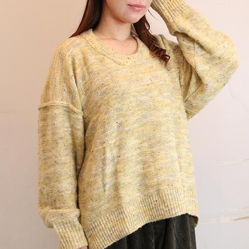 立体的なメランジ糸がつくる奥行きのある表情と、ゆったりシルエットの安心感が魅力。